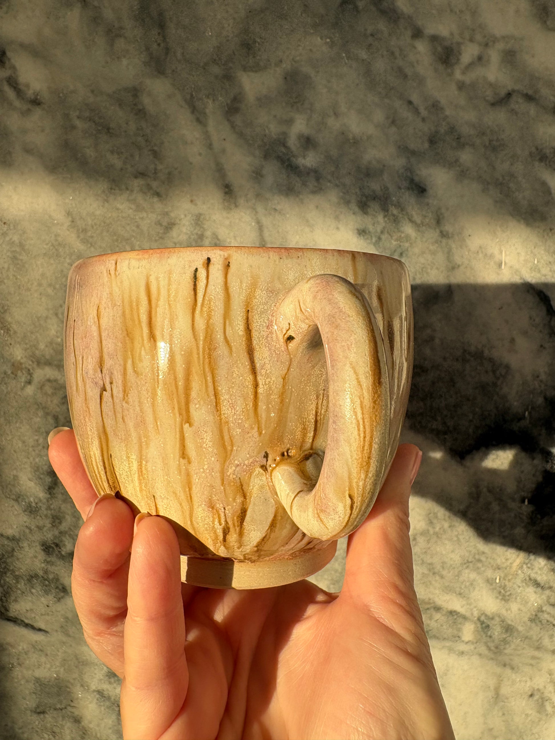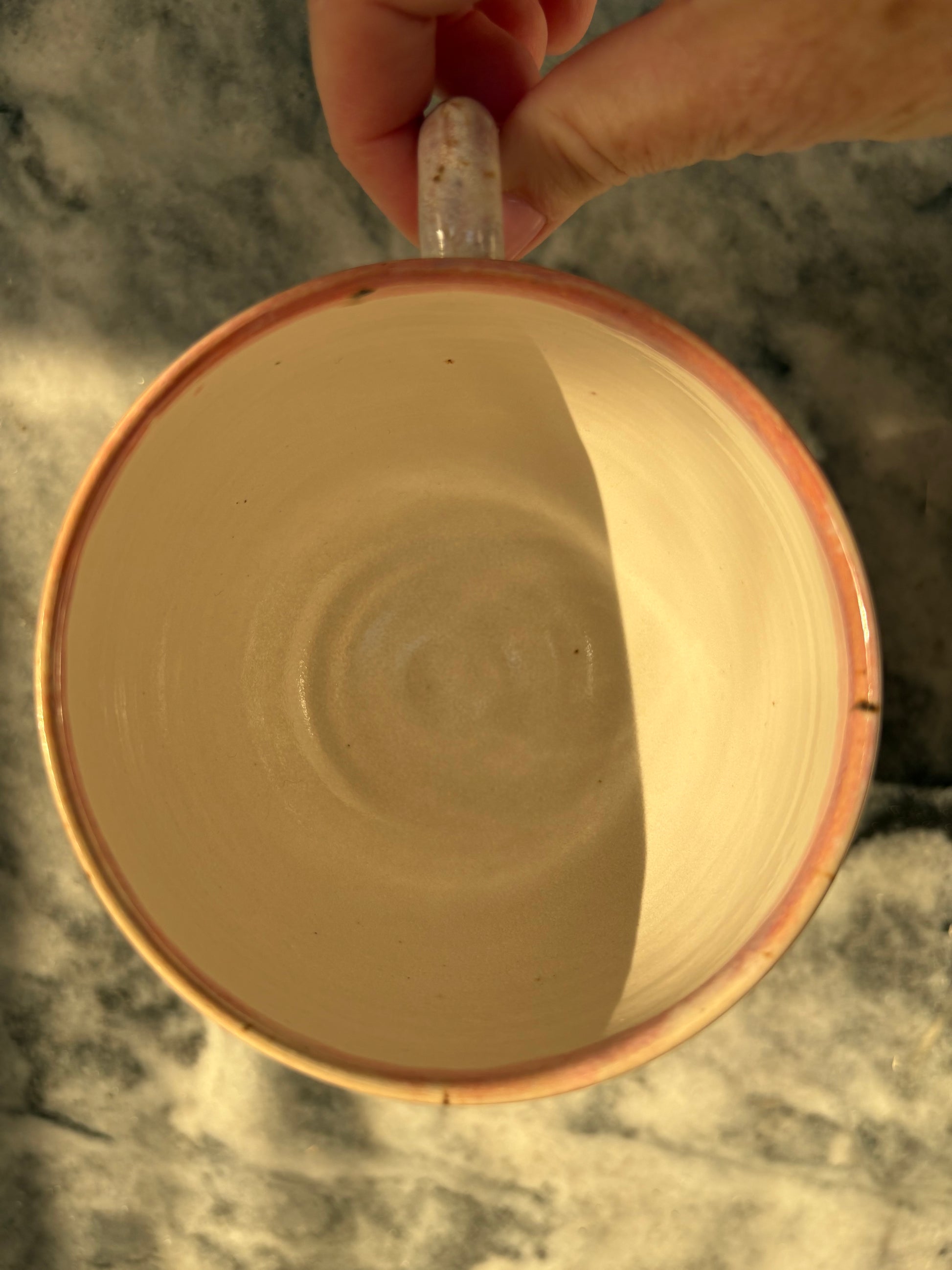 Den har en fin løftet fod og en rund hank. Hvid glossy indvendigt.