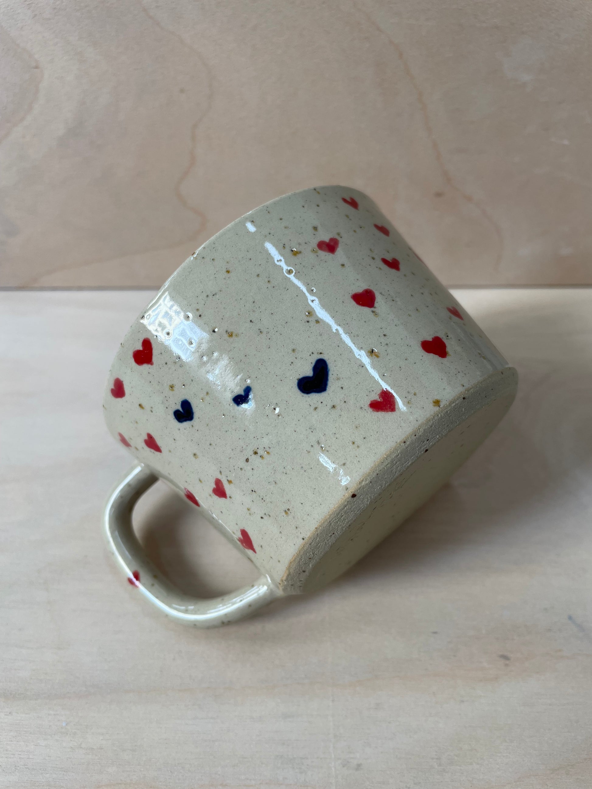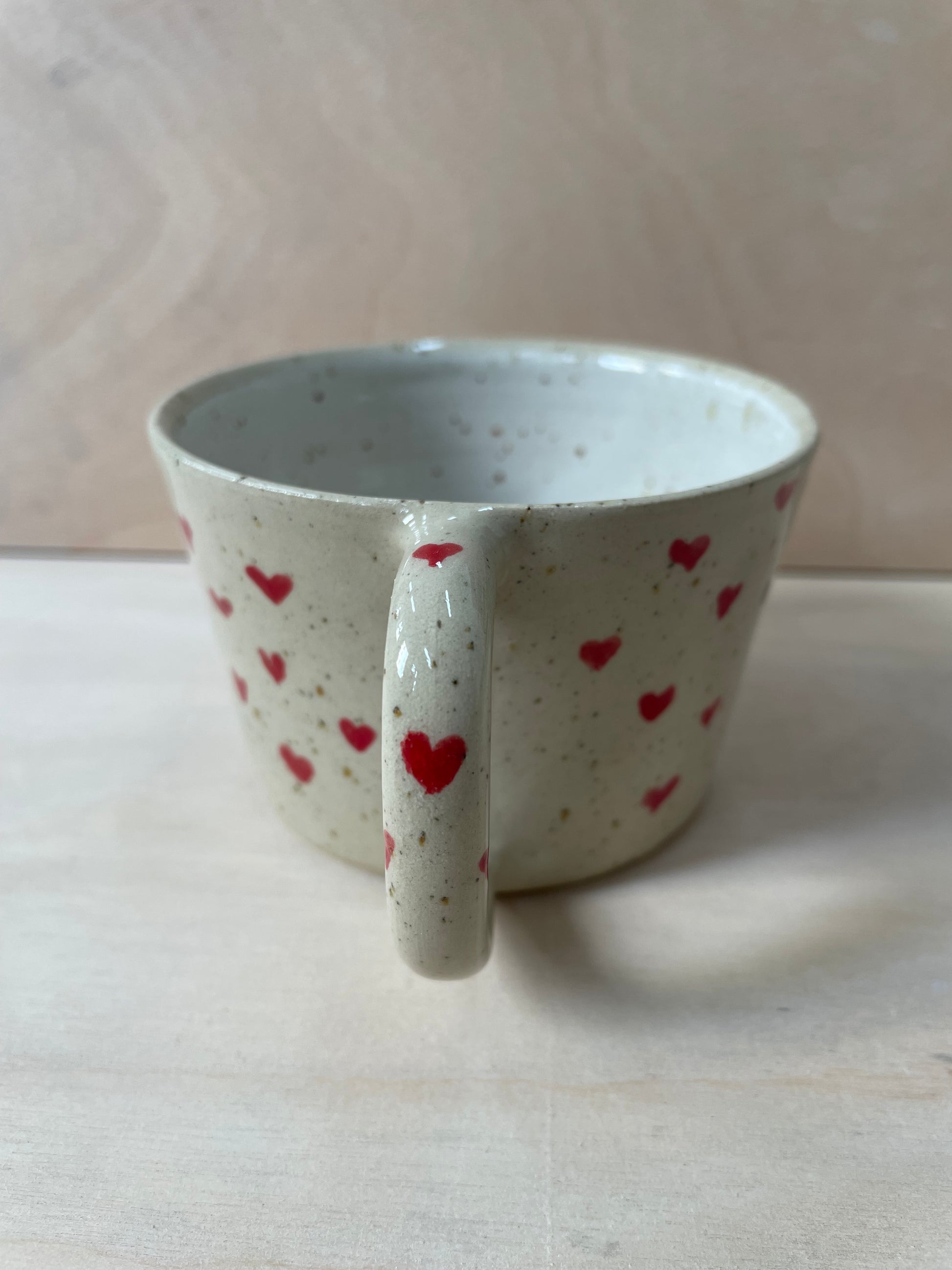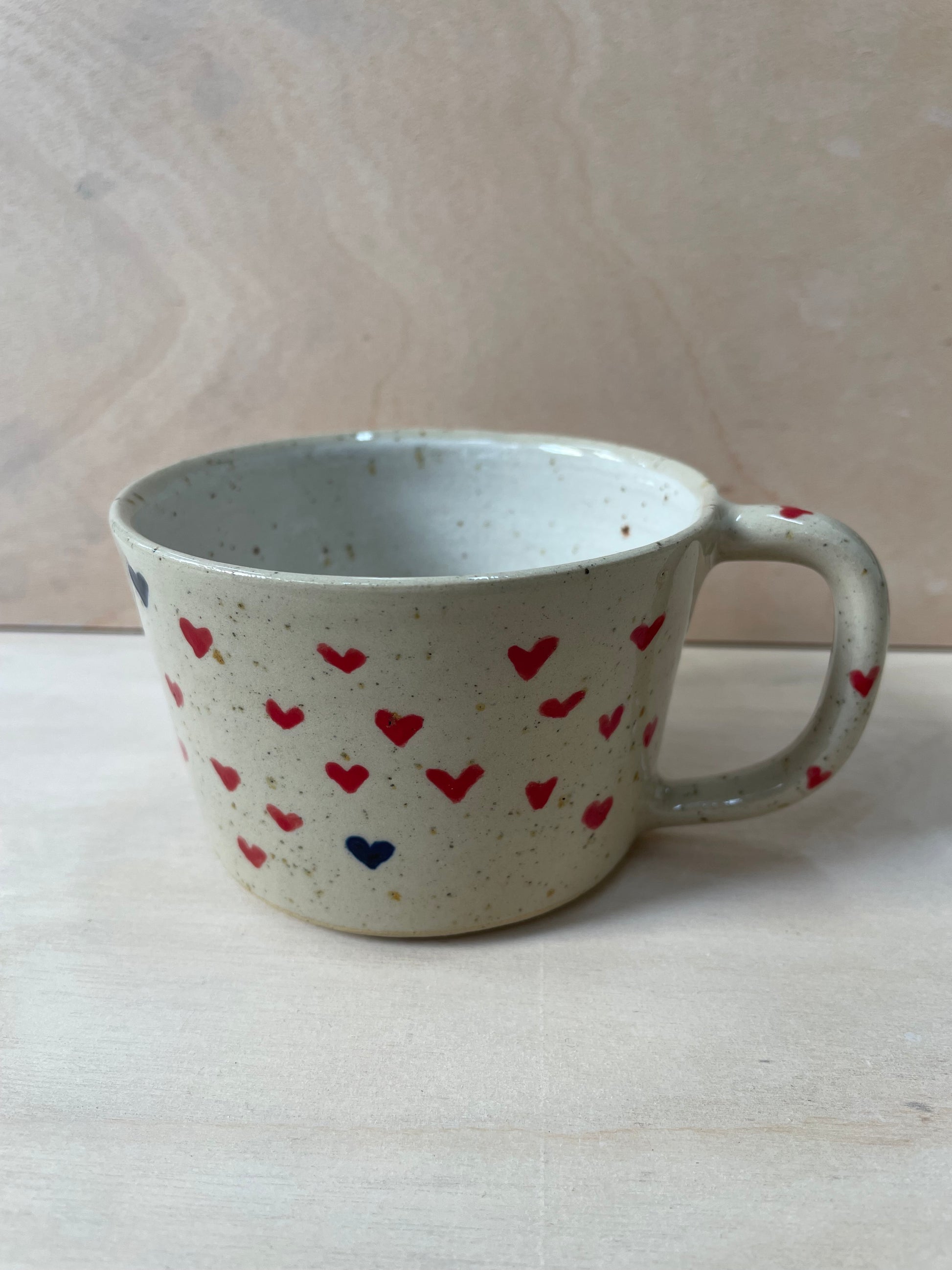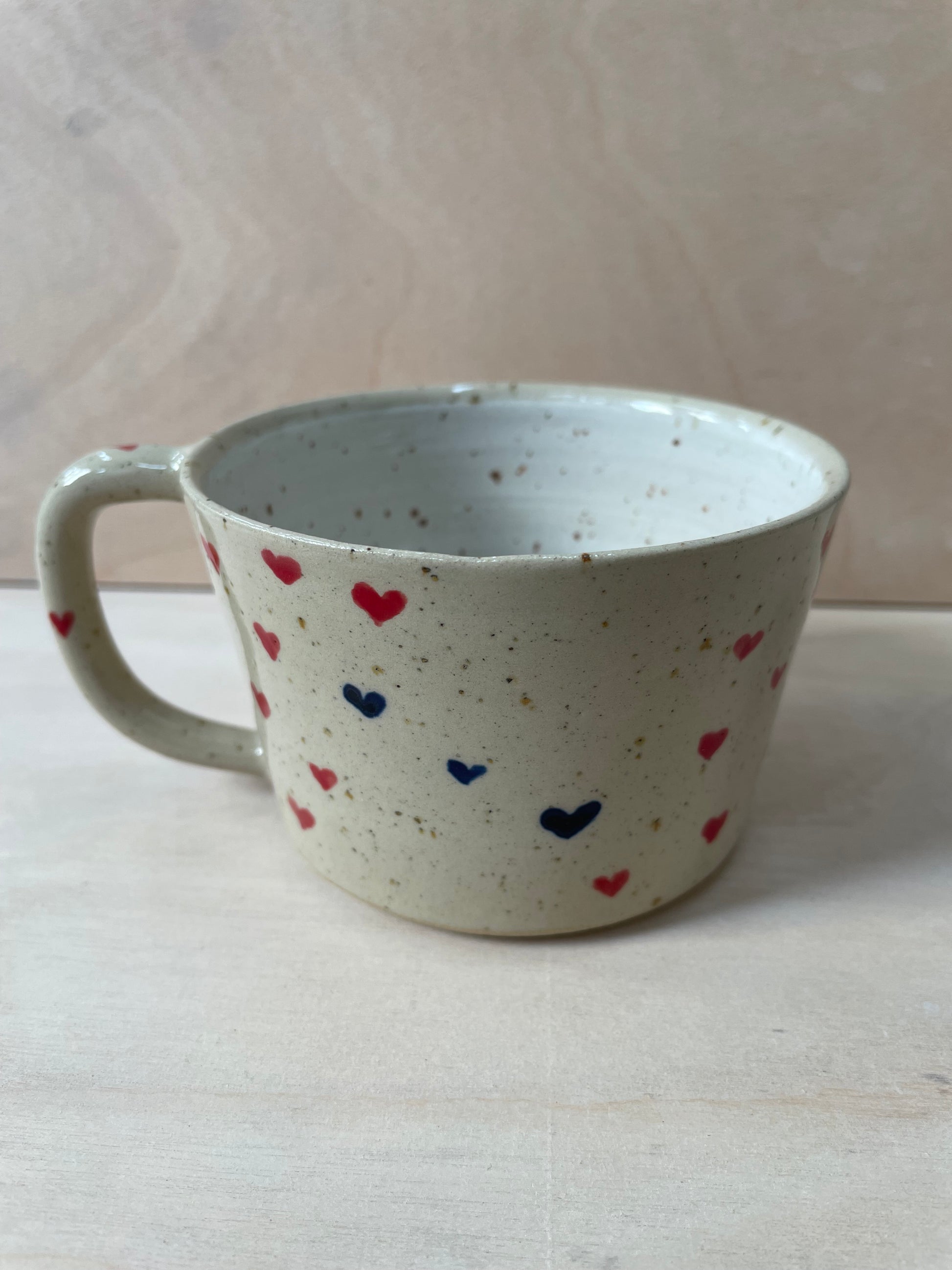 Drømmekop no. 1 med røde og blå håndmalede hjerter. Koppen har jeg drejet i stentøjsler med lavapletter. Den er glaseret transparent udvendigt og hvid indvendigt.