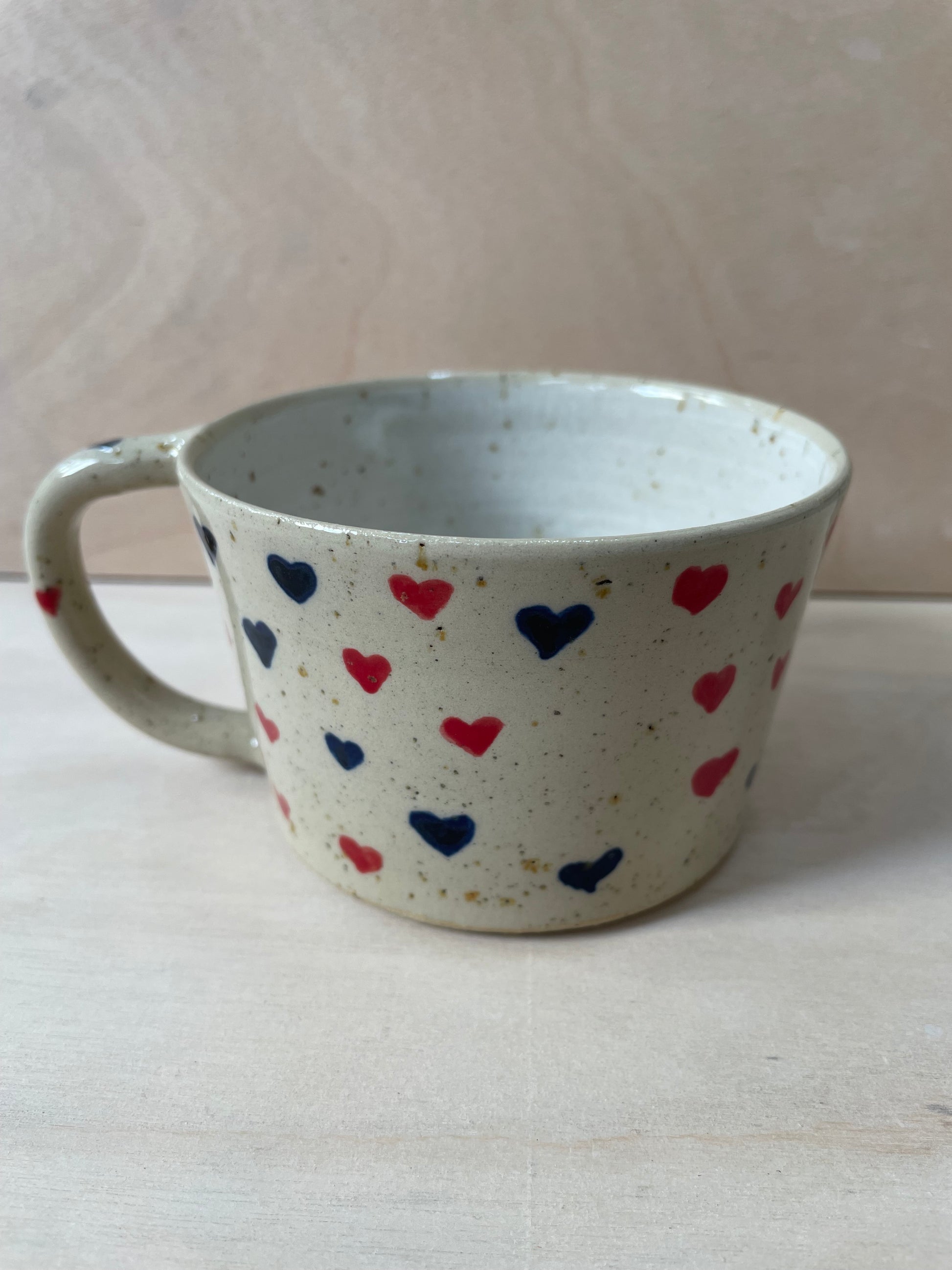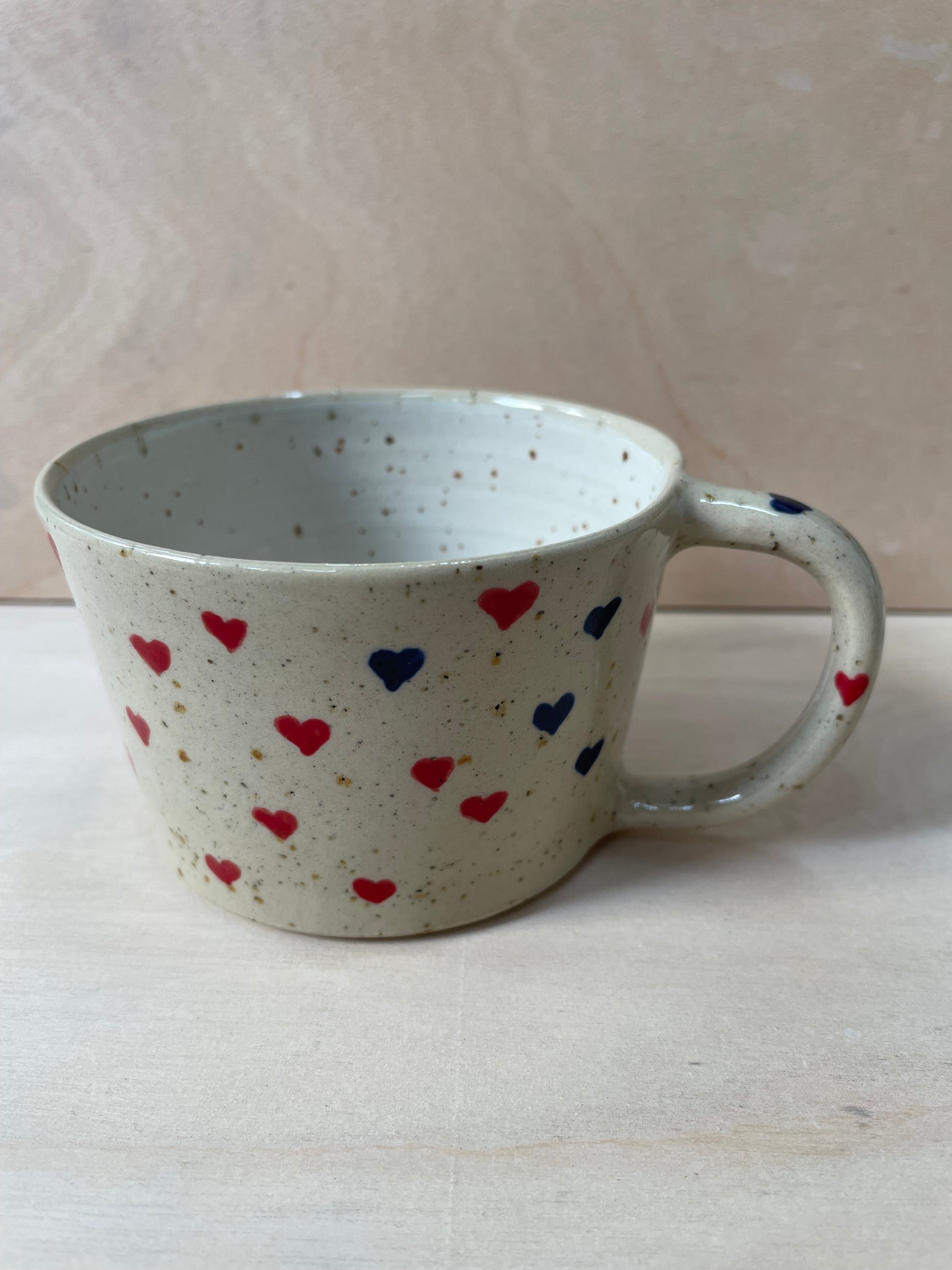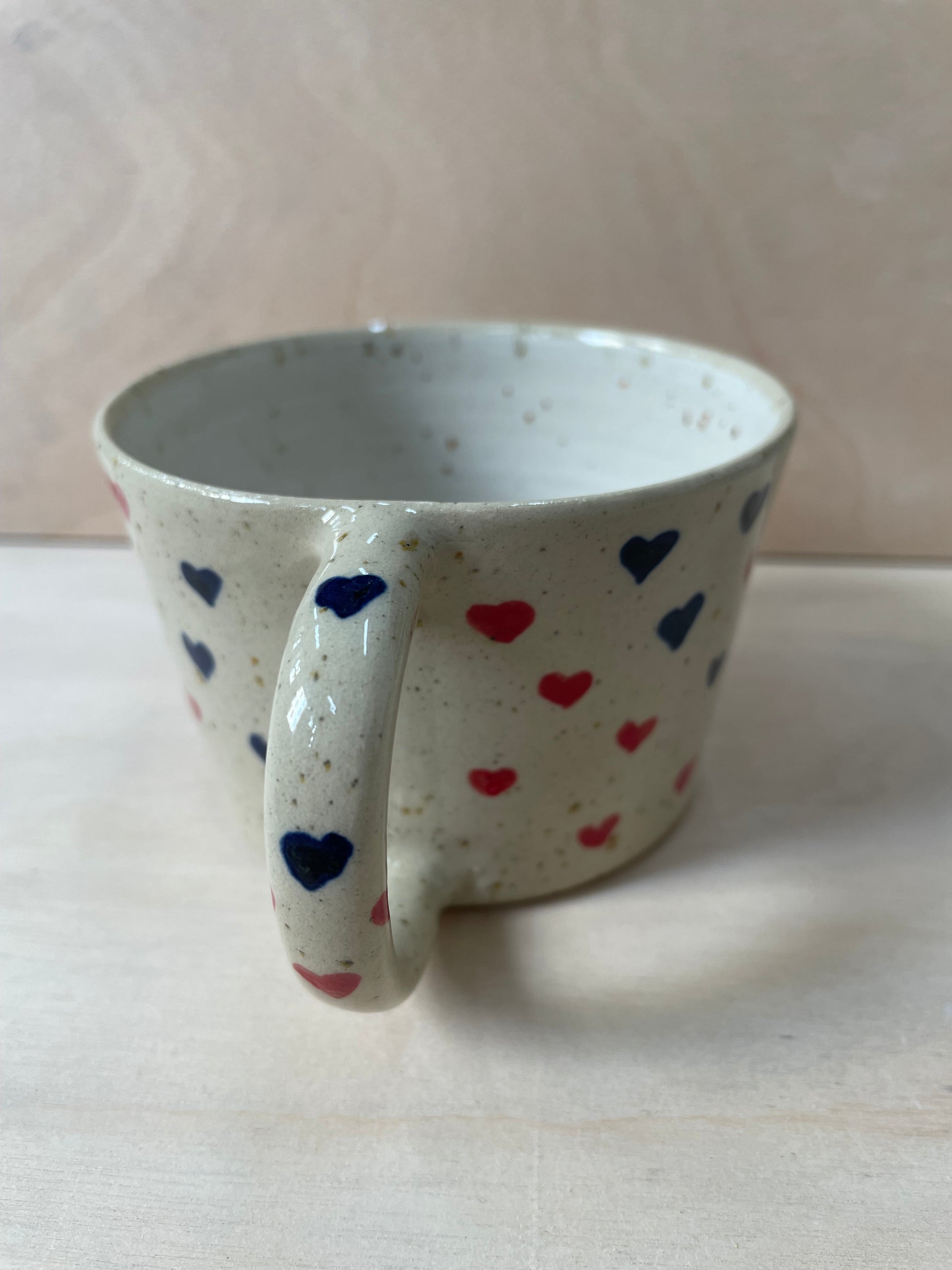Drømmekop no. 2 med røde og blå håndmalede hjerter. Koppen har jeg drejet i stentøjsler med lavapletter. Den er glaseret transparent udvendigt og hvid indvendigt.