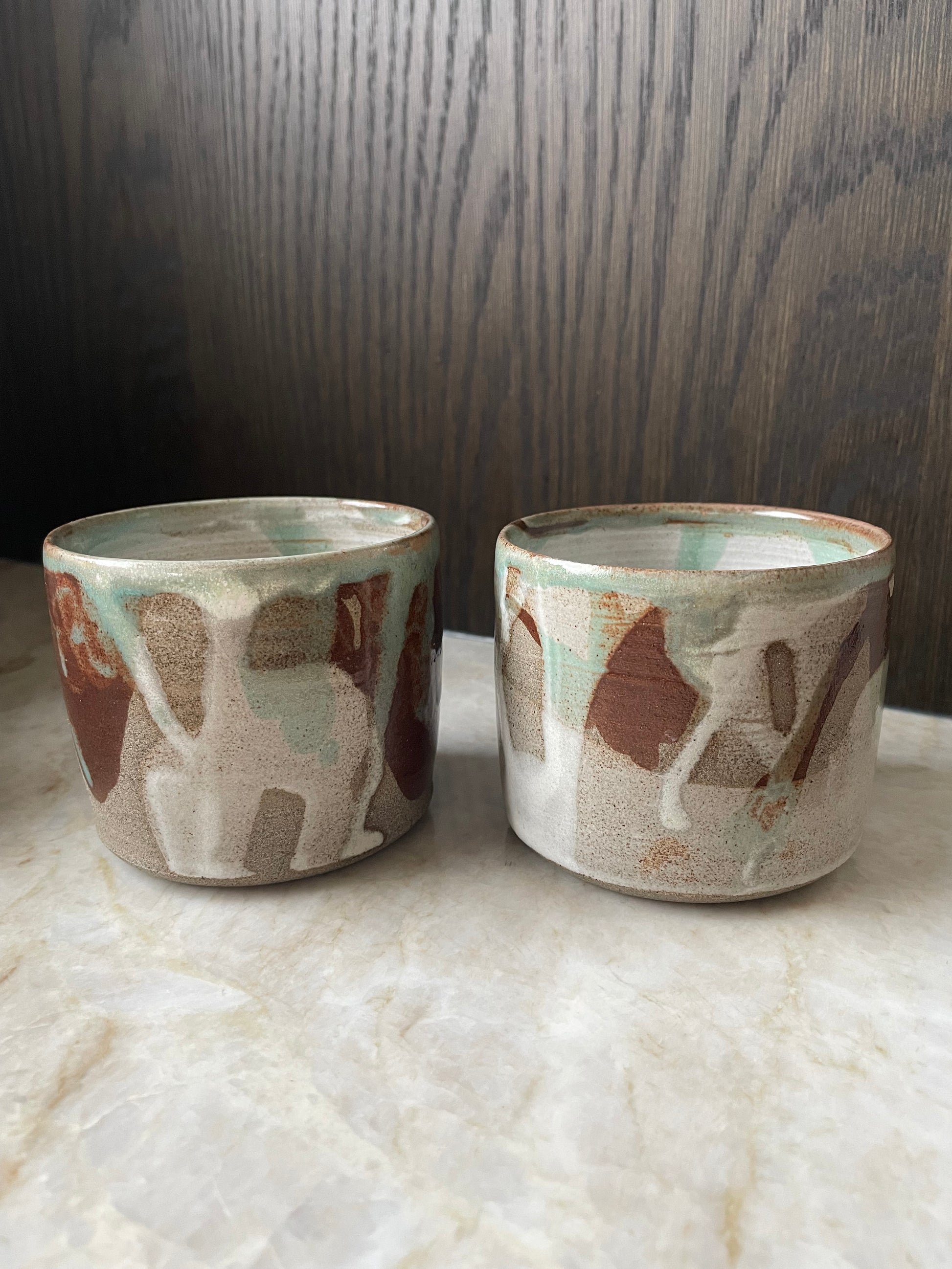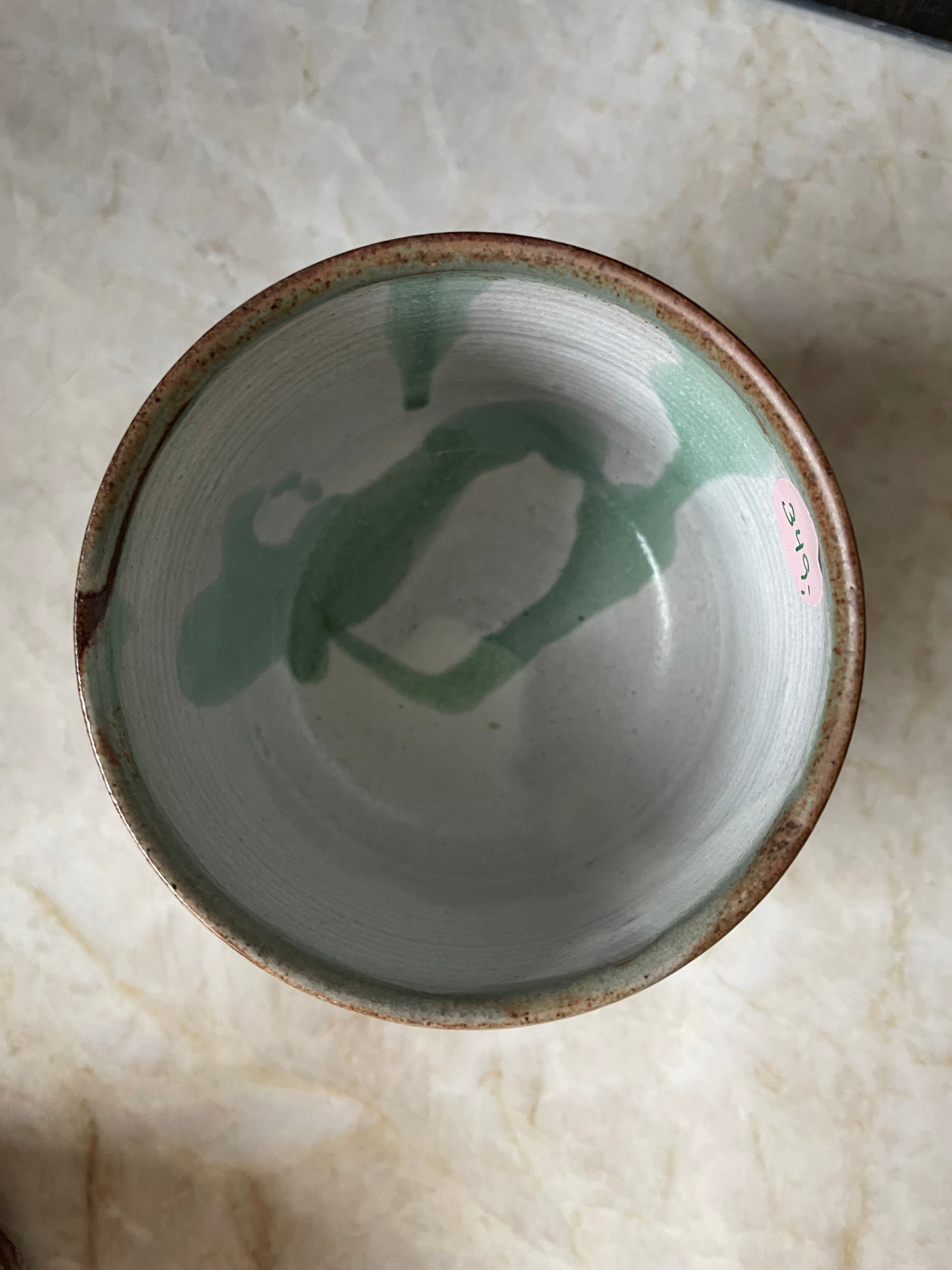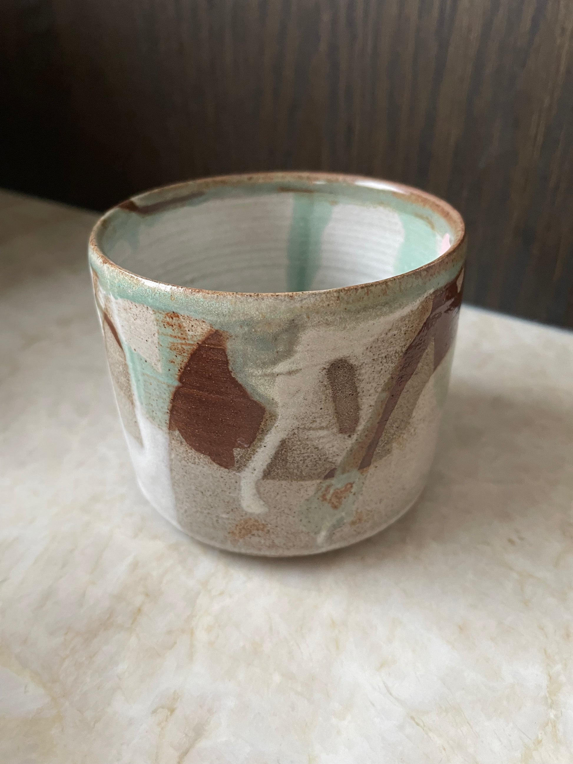 Krus med spændende glasering. Hvid indvendig. Drejet i mørkere stentøjsler.