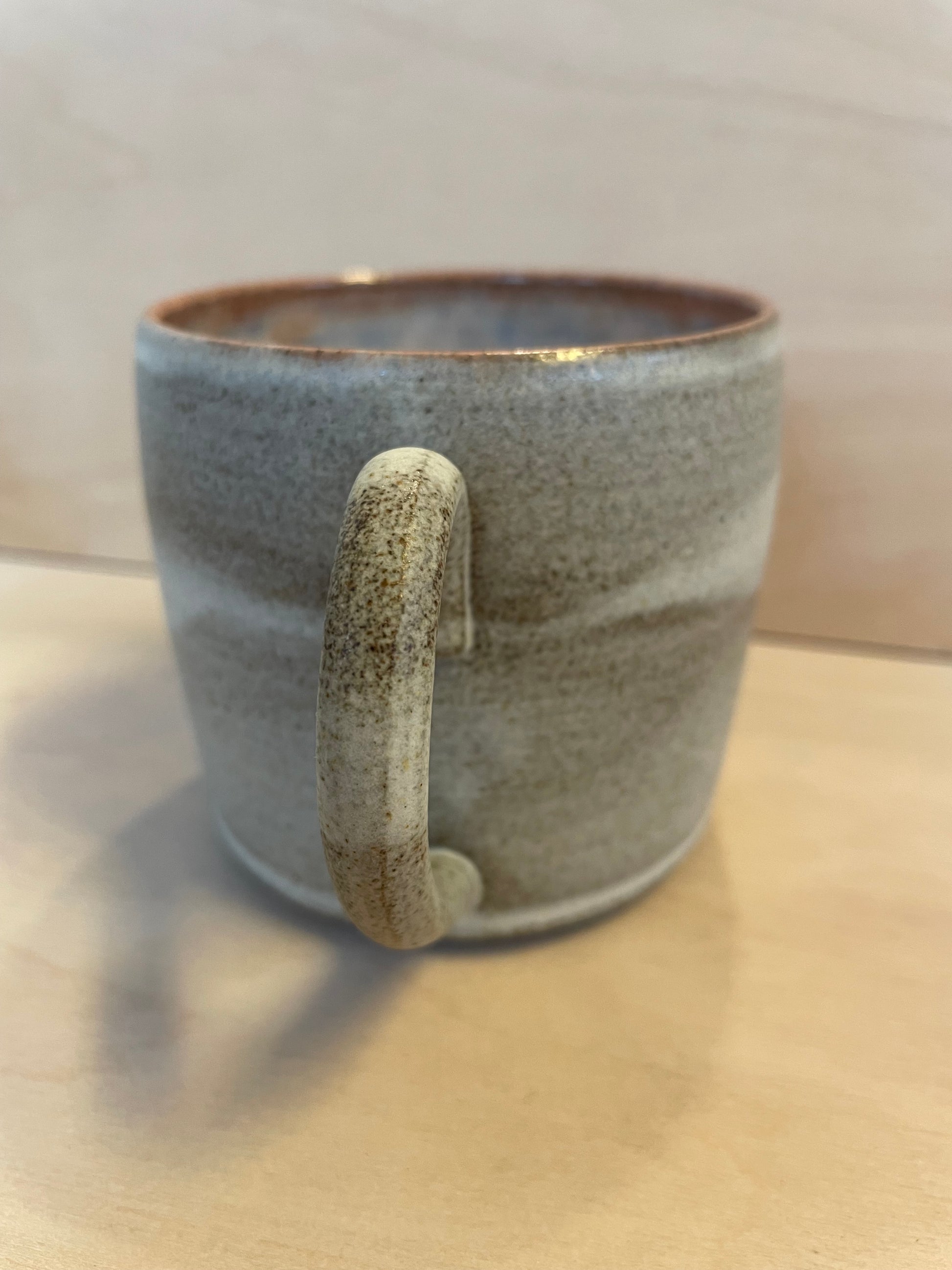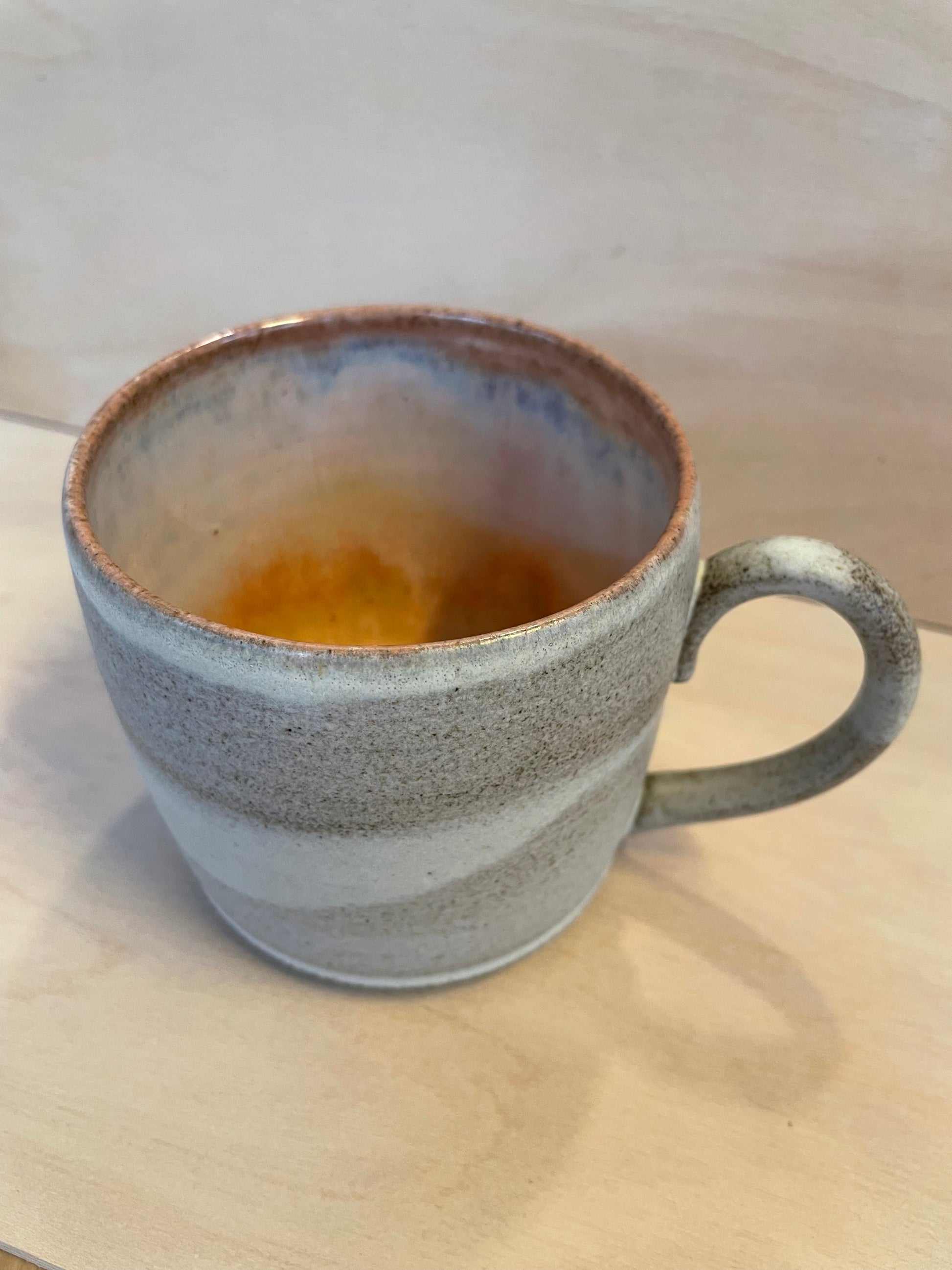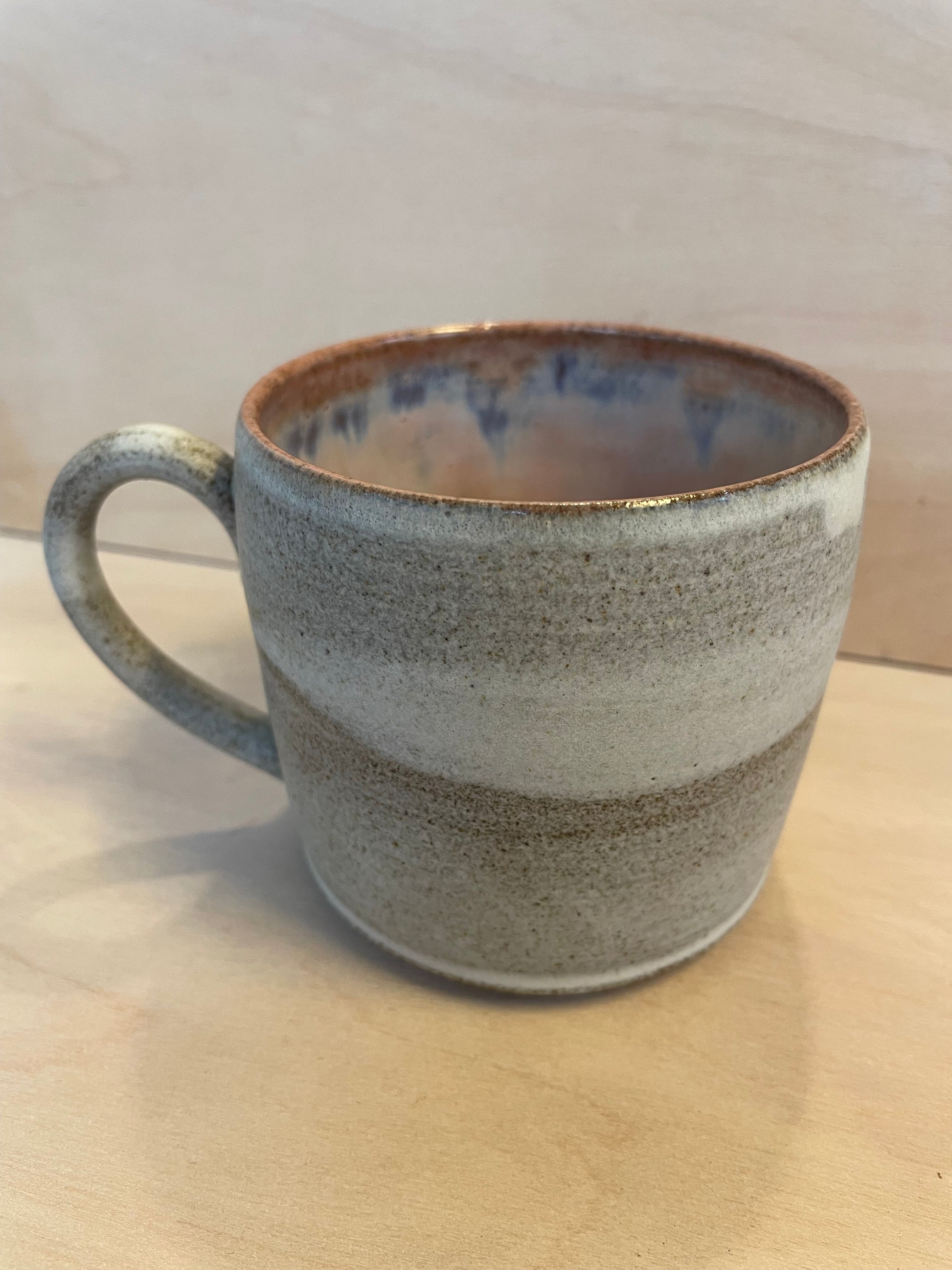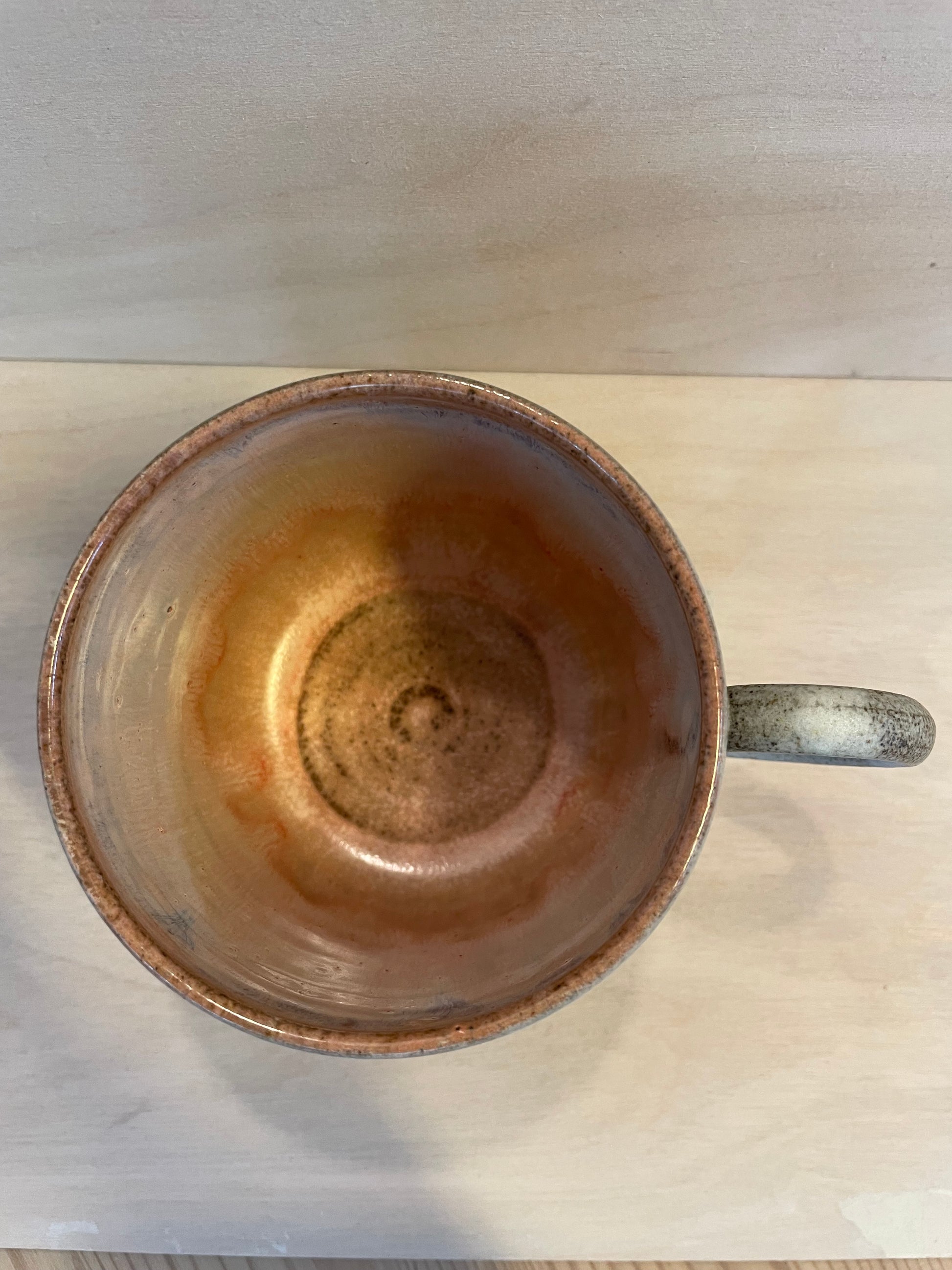 Krus med hank og vildeste glasur indvendigt i koppen.