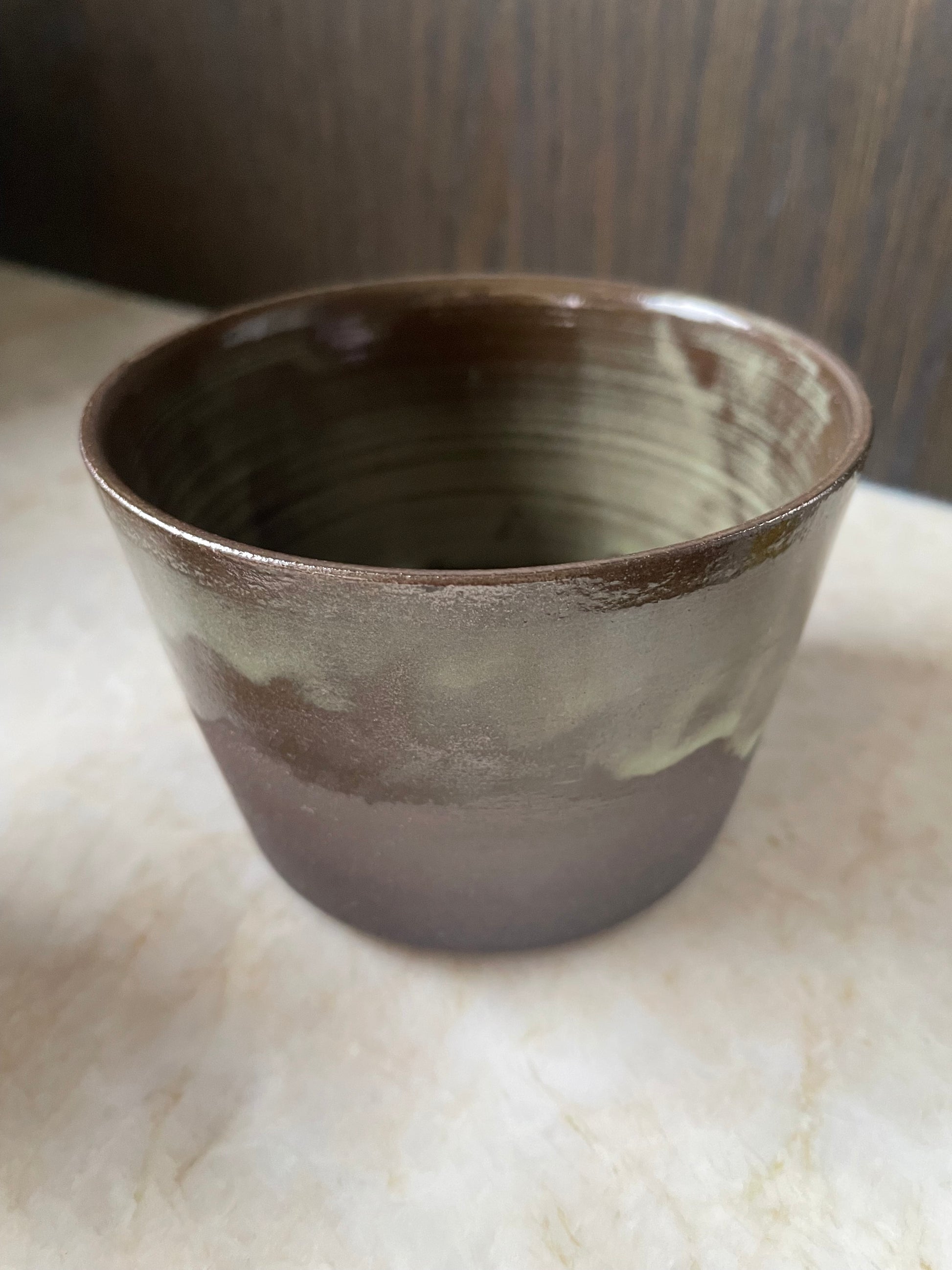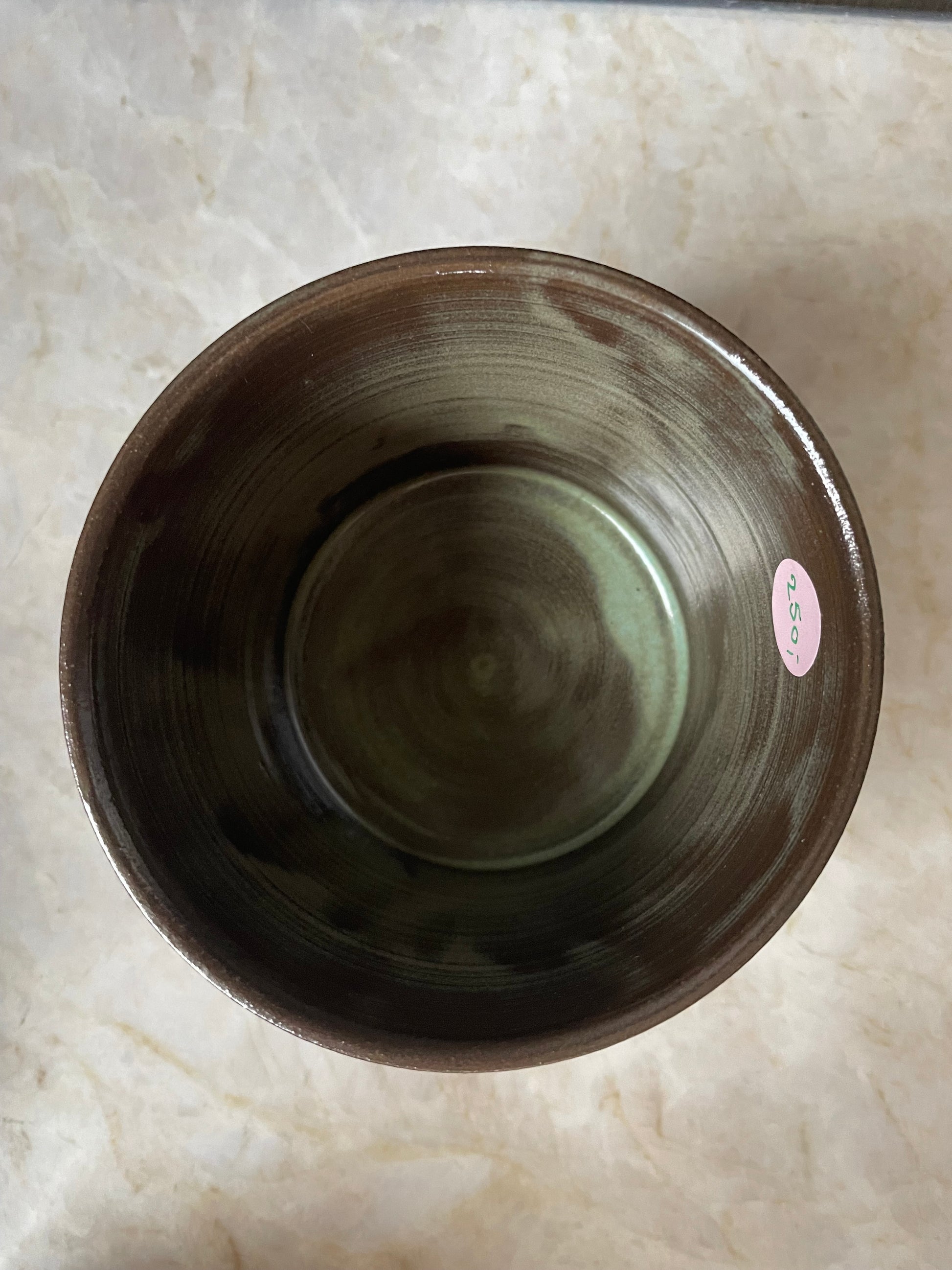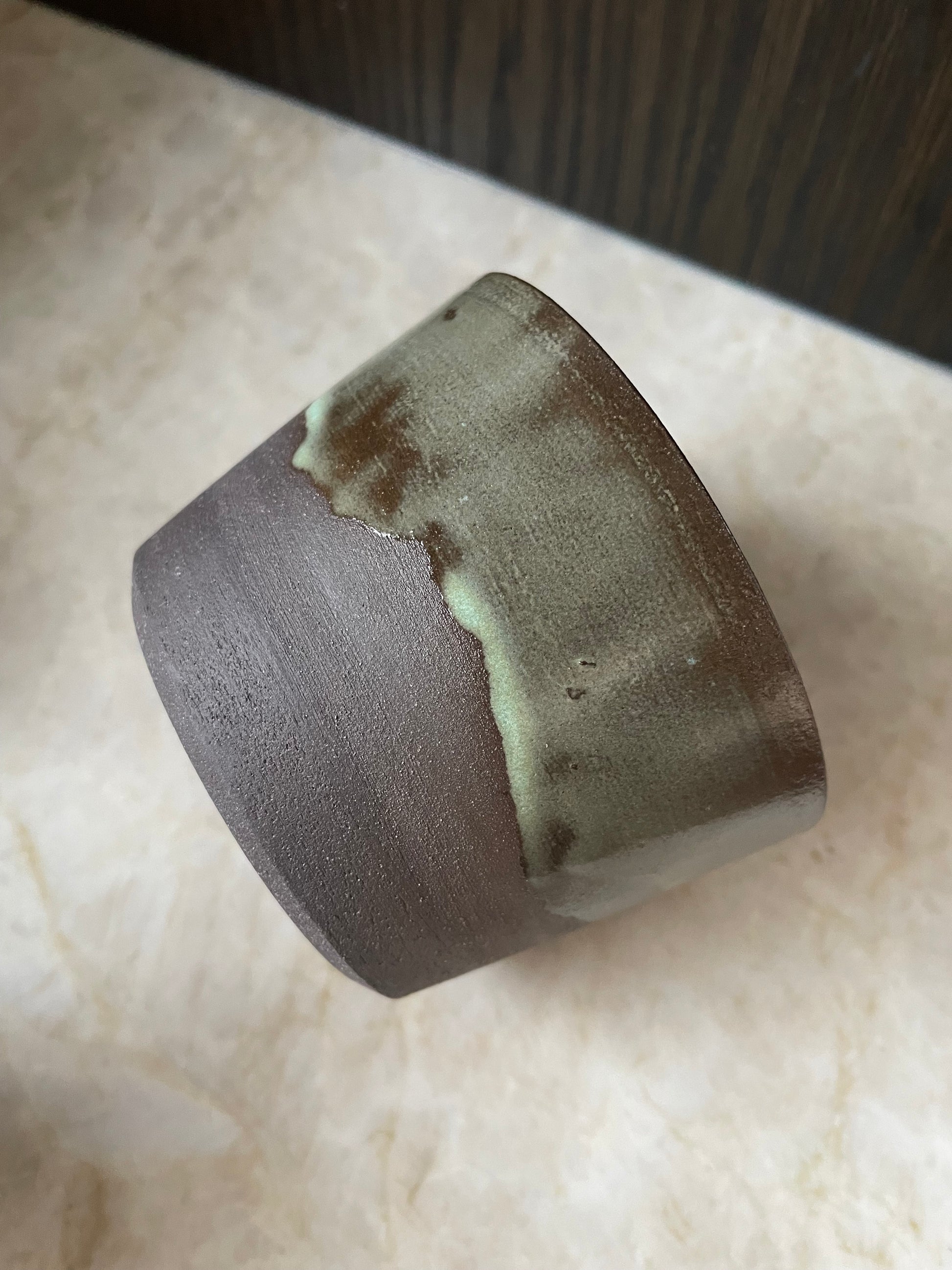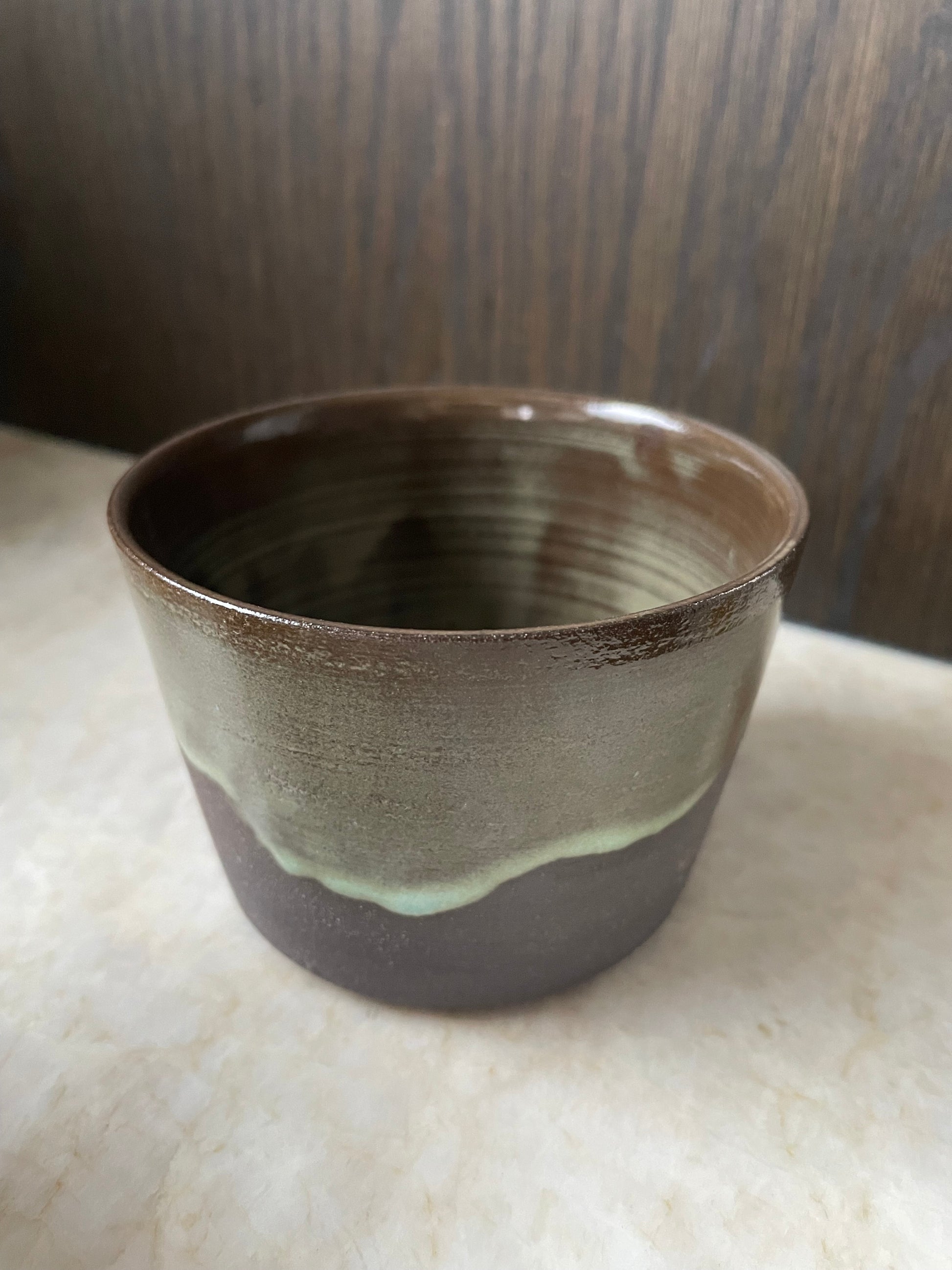 Krus drejet i sort stentøjsler og glaseret i en tone, der får tankerne hen på nordlys. Tyndt drejet og let i udtrykket.