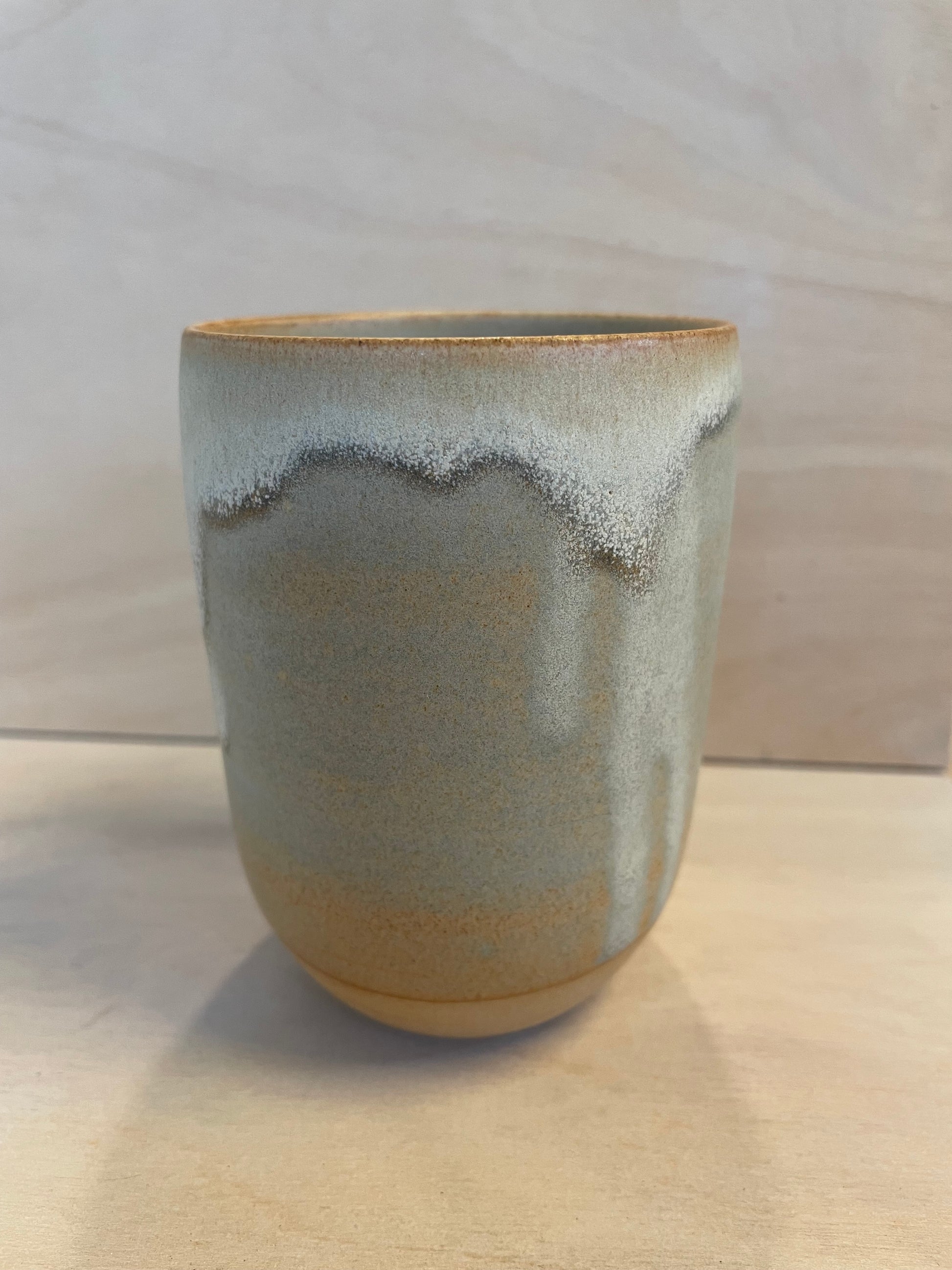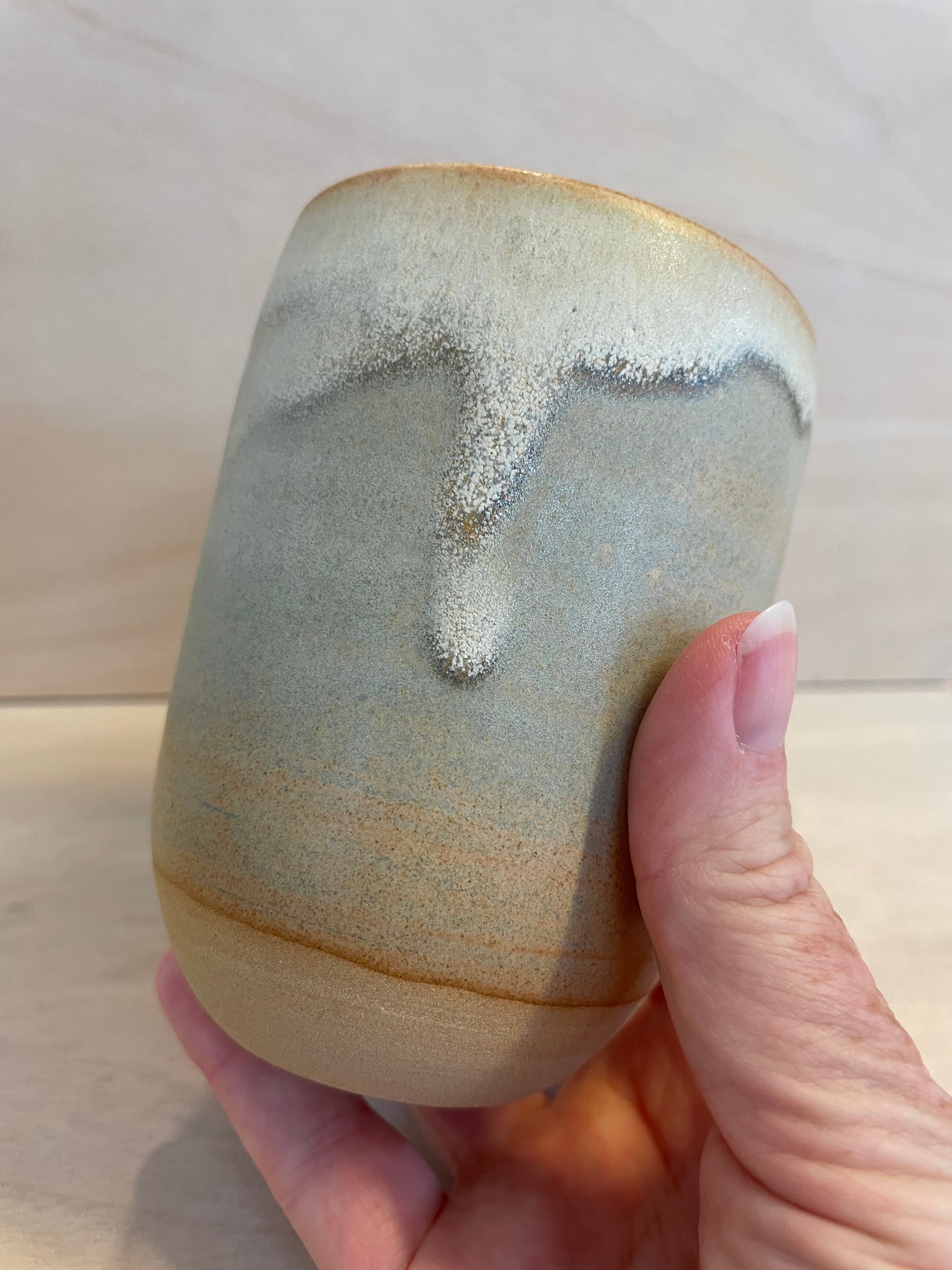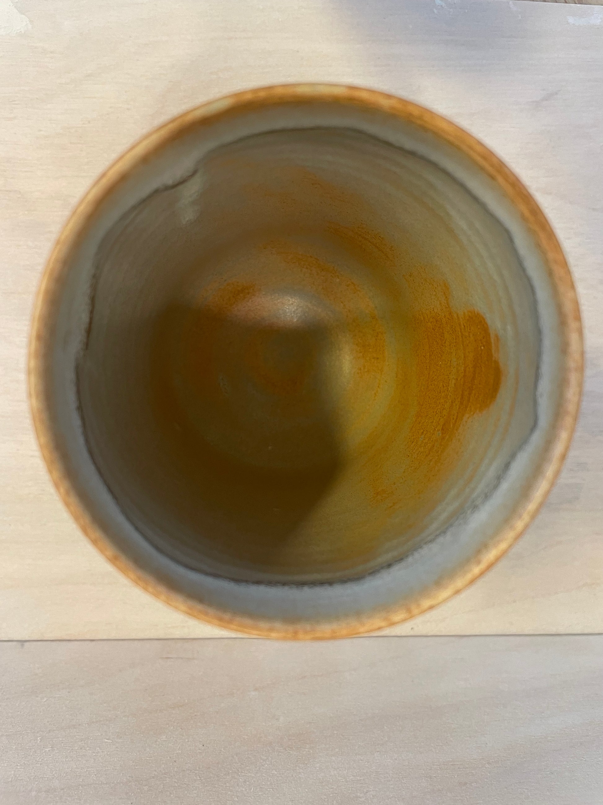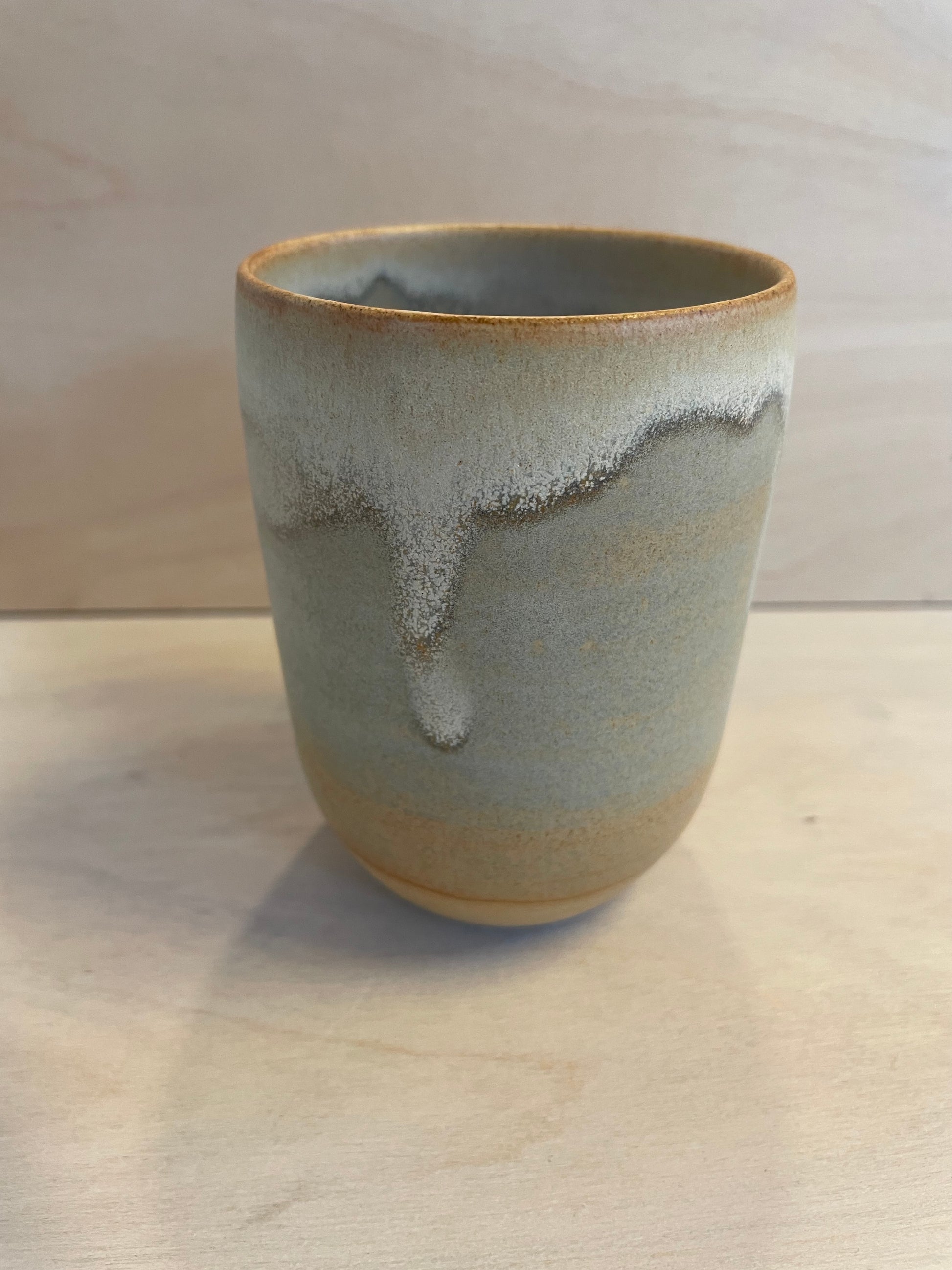 Smukkeste kop med så spændende glasurspil, drejet i en sandfarvet stentøjsler. Høj og slank og god at holde om.