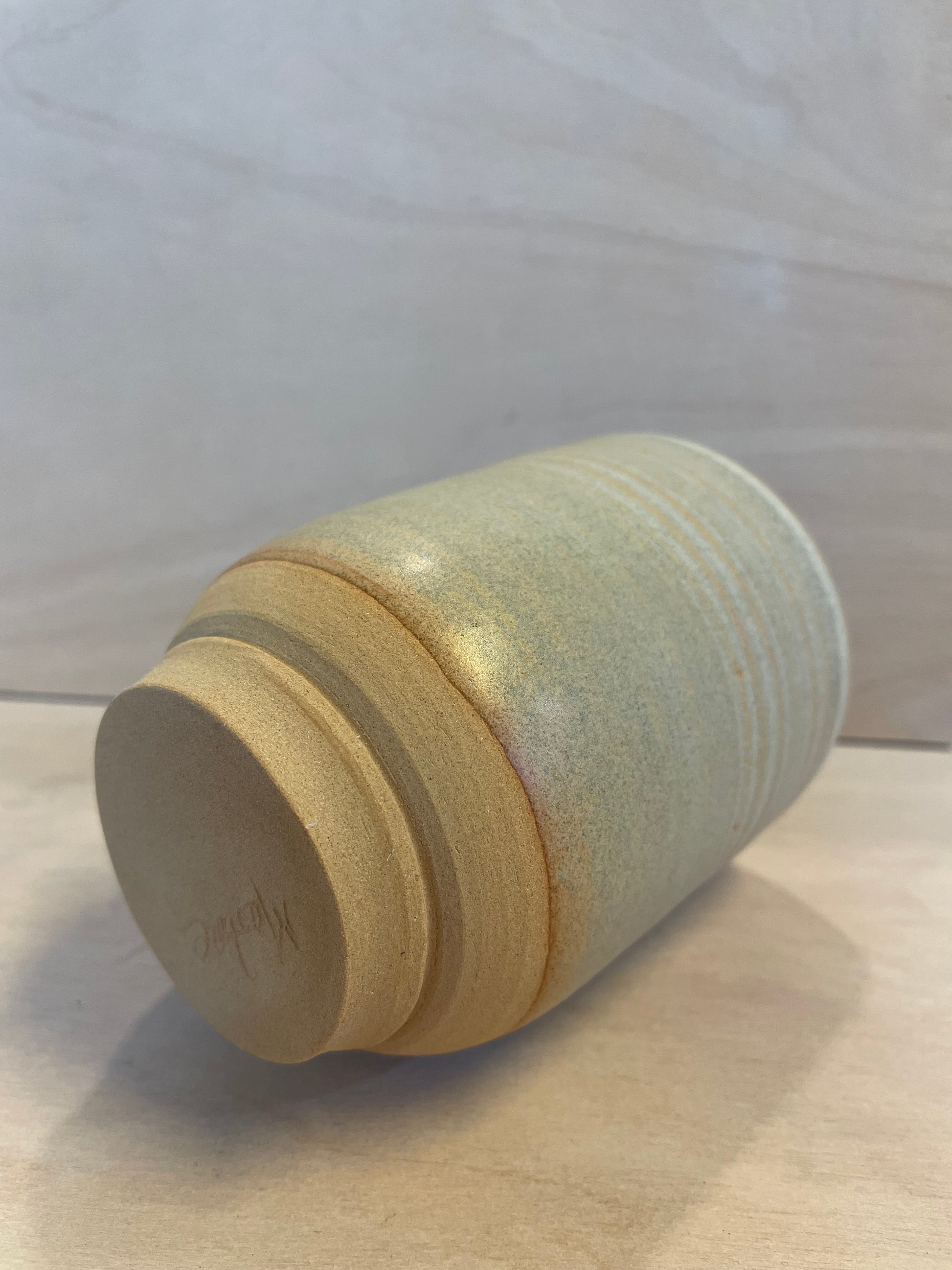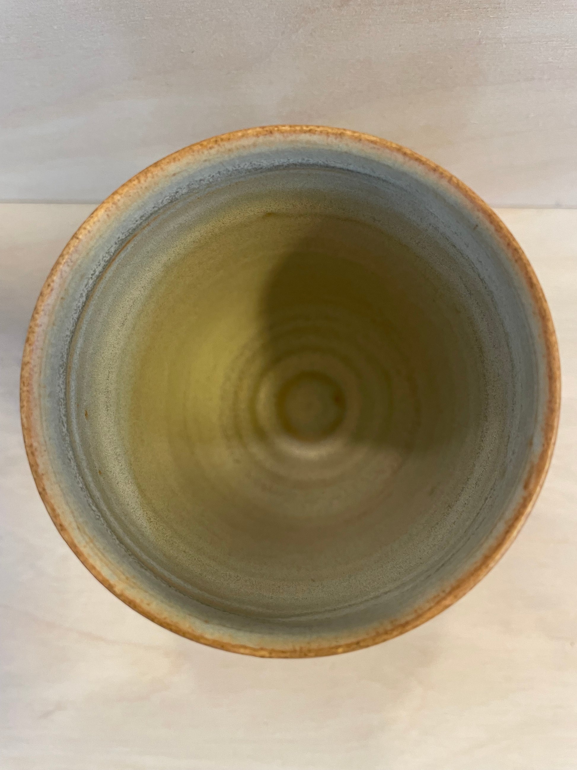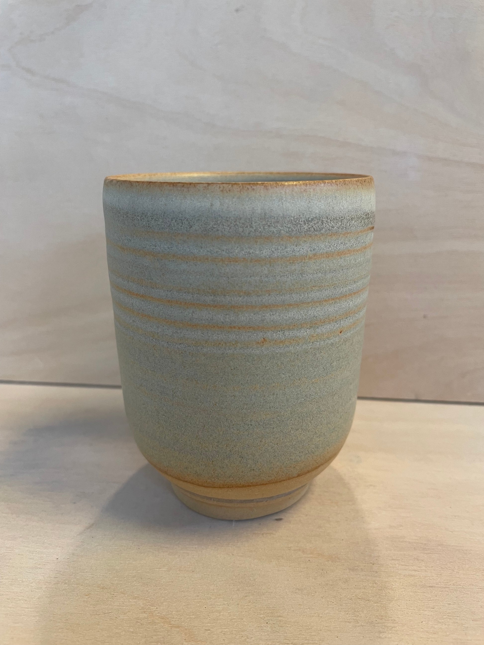 Smukkeste kop med spændende glasurspil, drejet i sandfarvet stentøjsler. Høj og slank og god at holde om.