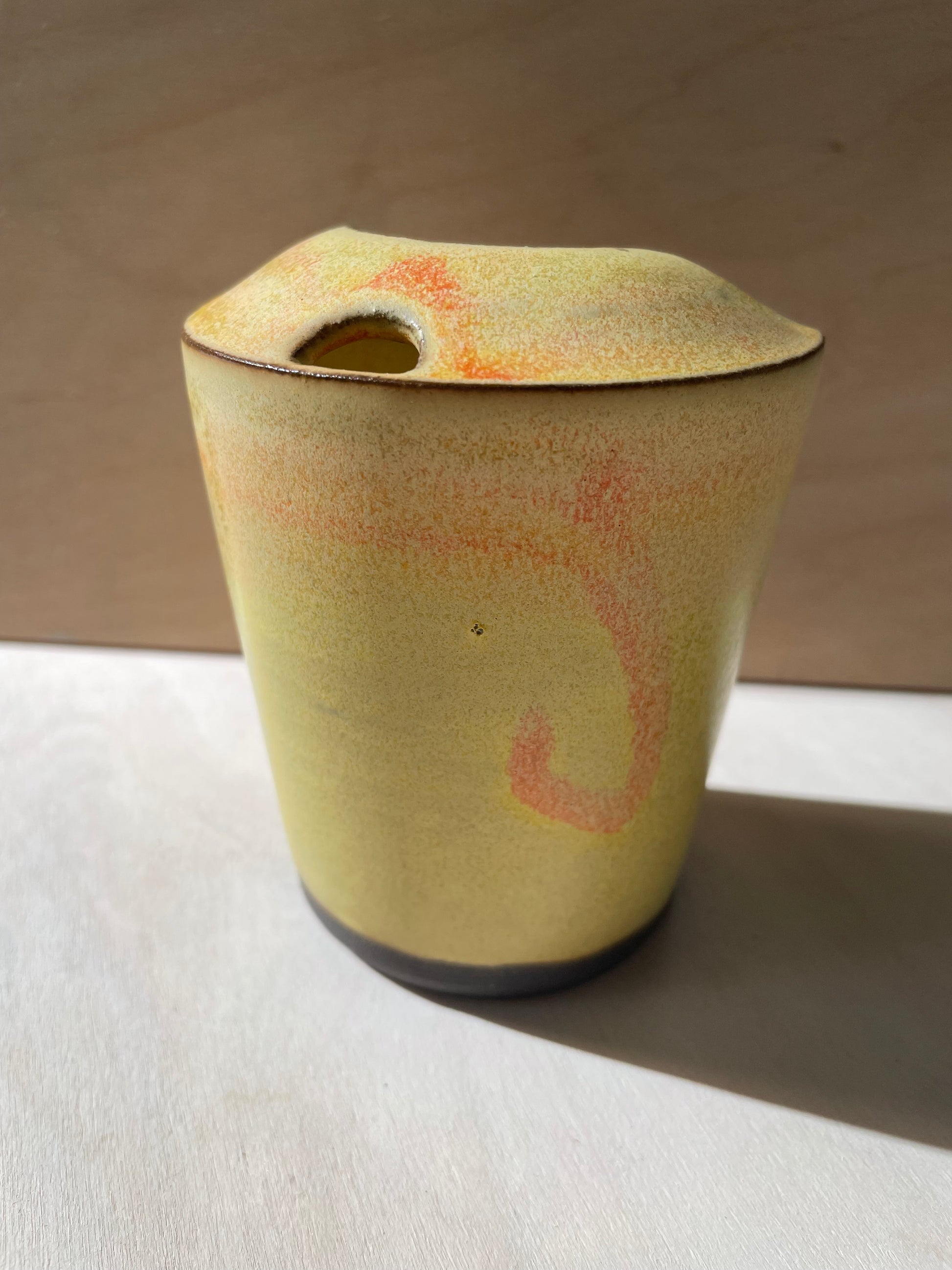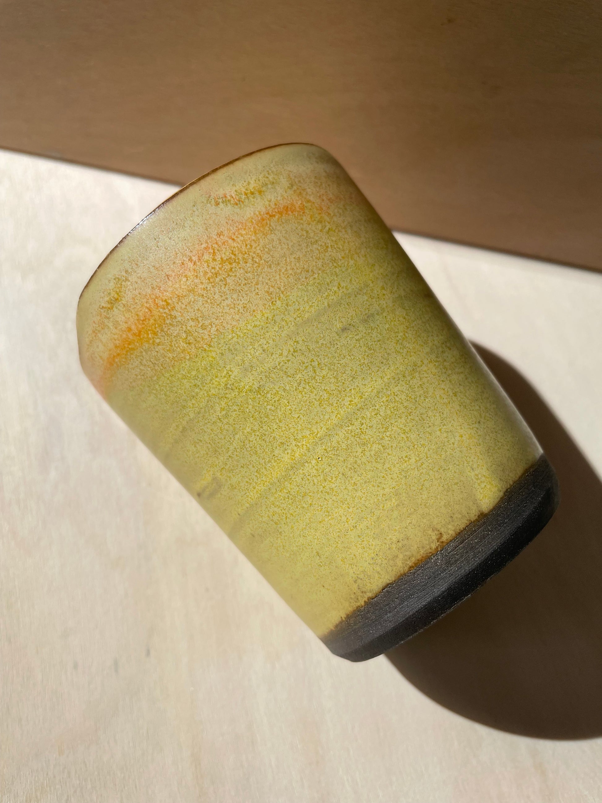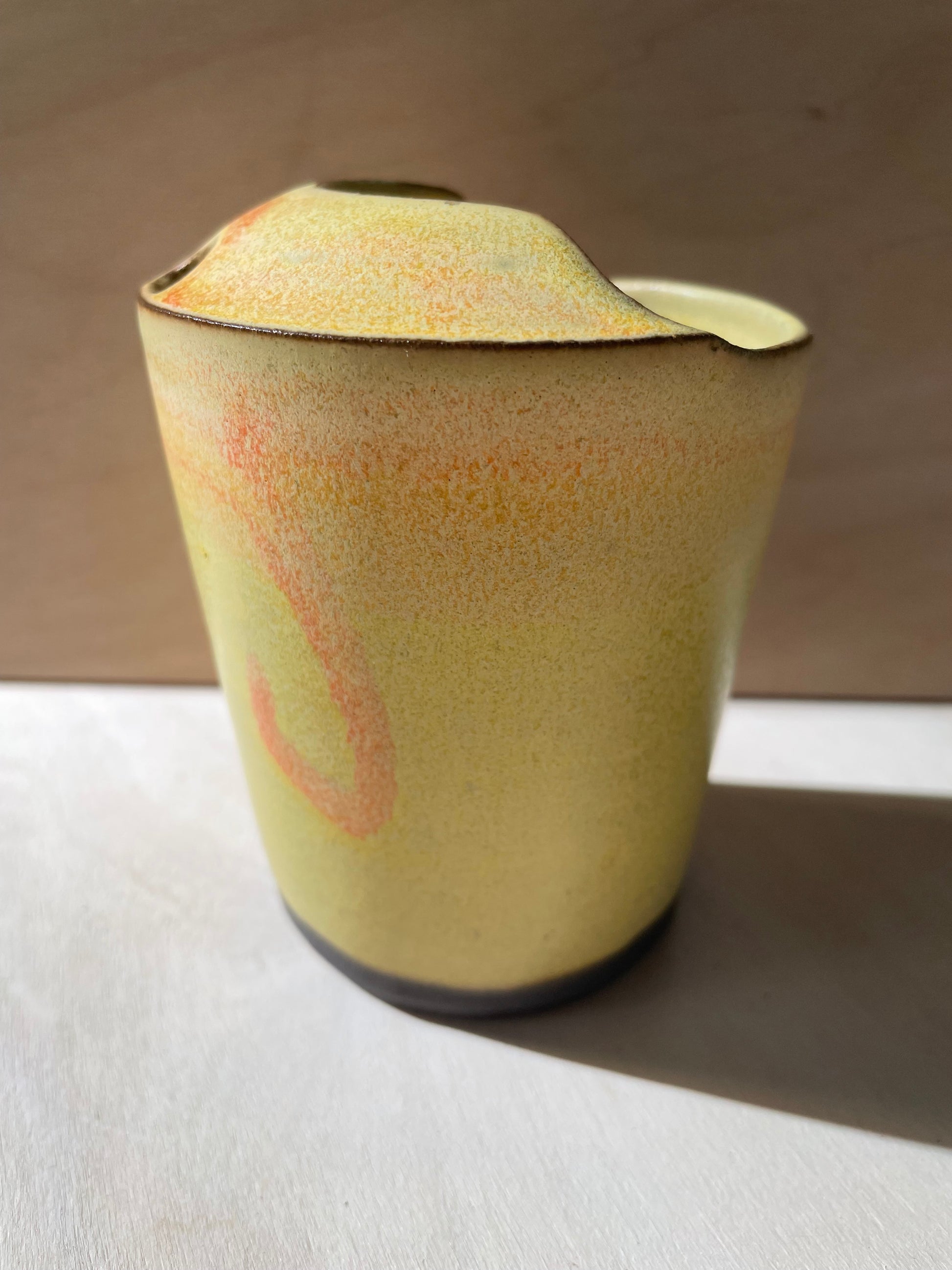 To go kop drejet i mørk ler og glaseret i gylden gul nuance og orange.